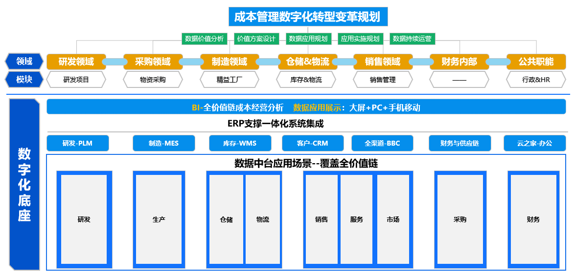 数字化底座,企业在经营过程会产生大量有用的数据,这些数据都是企业有利用价值的资产,随着企业的业务规模的不断扩大,产生的数据靠人工处理,EXCEL处理是远不能满足企业管理的需要。因此需要借助数字化的工具来记录,存储,运算经营价值链中的数据,为企业提升运营效率。从经营价值链来看,企业核心的经营数据包含研发,采购,制造,供应链,销售,财务,人力等专业模块的数据,如何管理好这些数据,就需要依靠完整的数字化应用中台来完成,针对不同的经营价值链环节,都有专业的数字化应用工具,比如PLM-研发,MES-制造,CRM-客户,BBC-销售,ERP-财务&供应链等应用模块,来满足不同专业领域的需求,通过ERP一体化平台的建设,使企业的数据为管理赋能,提升运营效率,降低管理成本,并且可以通过数字化运营为企业创造价值。
