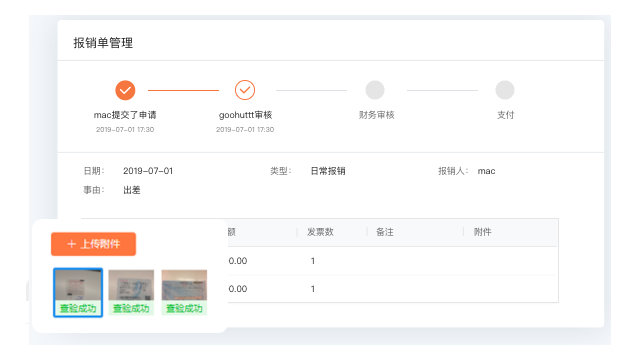 支持增值税电子发票/纸质发票、高铁票、飞机票等识别,发票查验真伪、查重,避免重复报销,自动进行价税分离,简化录入